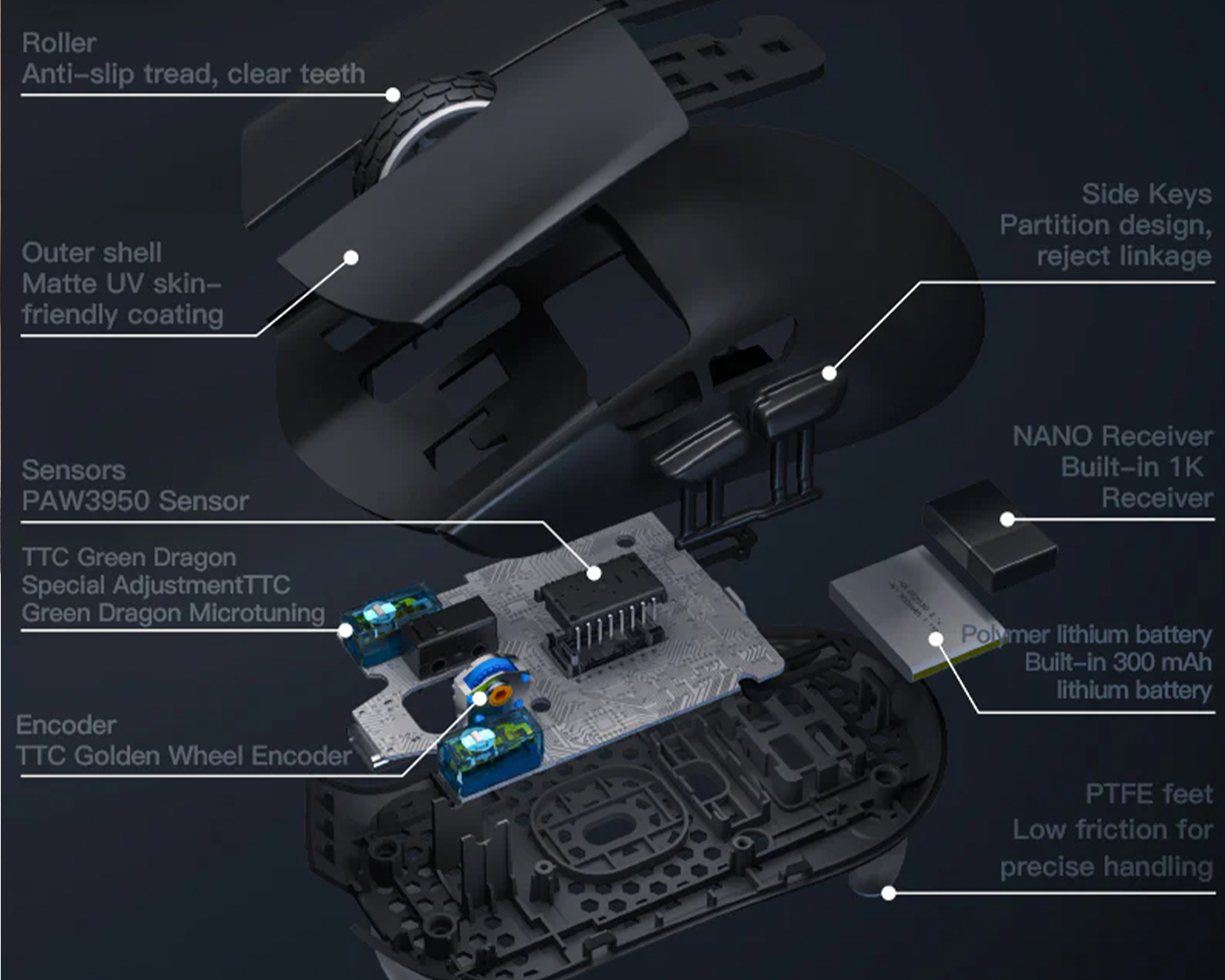 Pixart'ın en yeni sensörlerinden olan Pixart PAW3950 ve Nordic 52840 işlemciye sahiptir. Yüksek stabilite ve rekabetçi performans sunar.