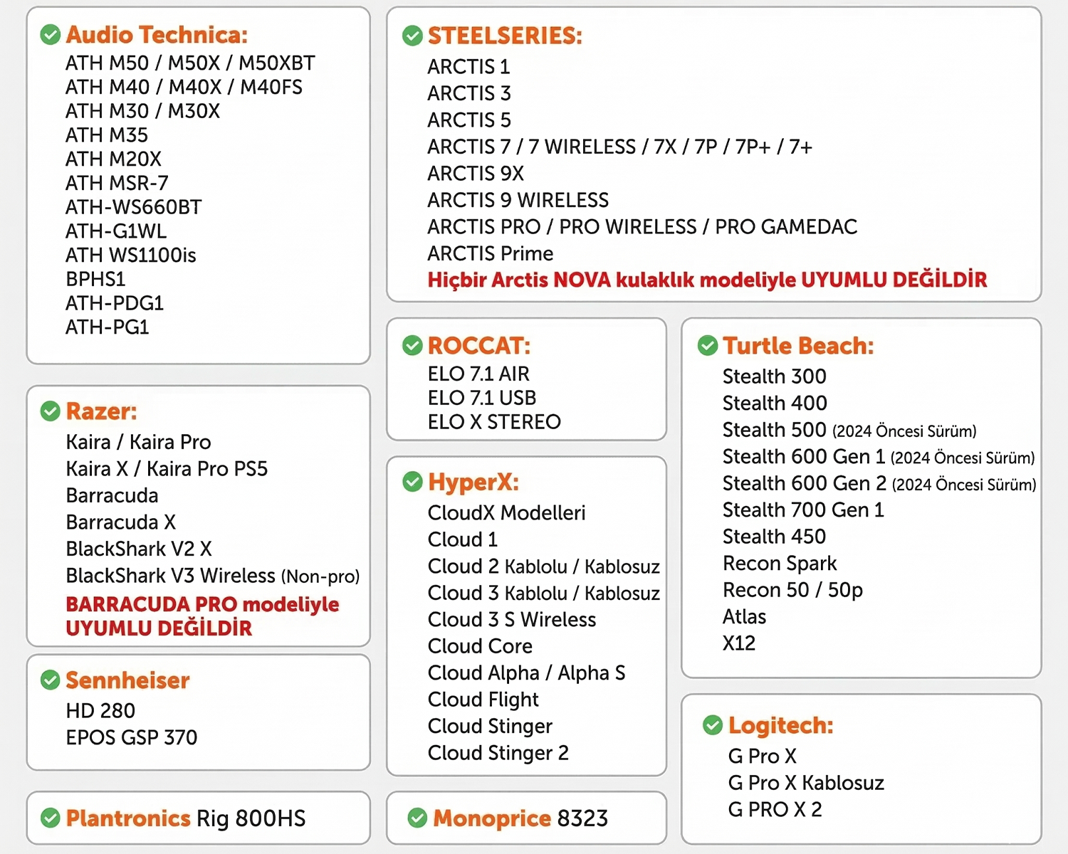 Uyumluluk tablosunu kontrol ederek kulaklığınıza uygun olup olmadığını kontrol edebilirsiniz.