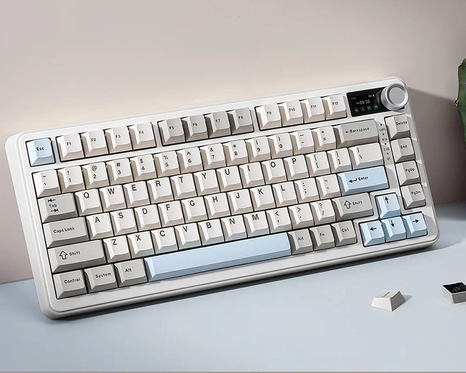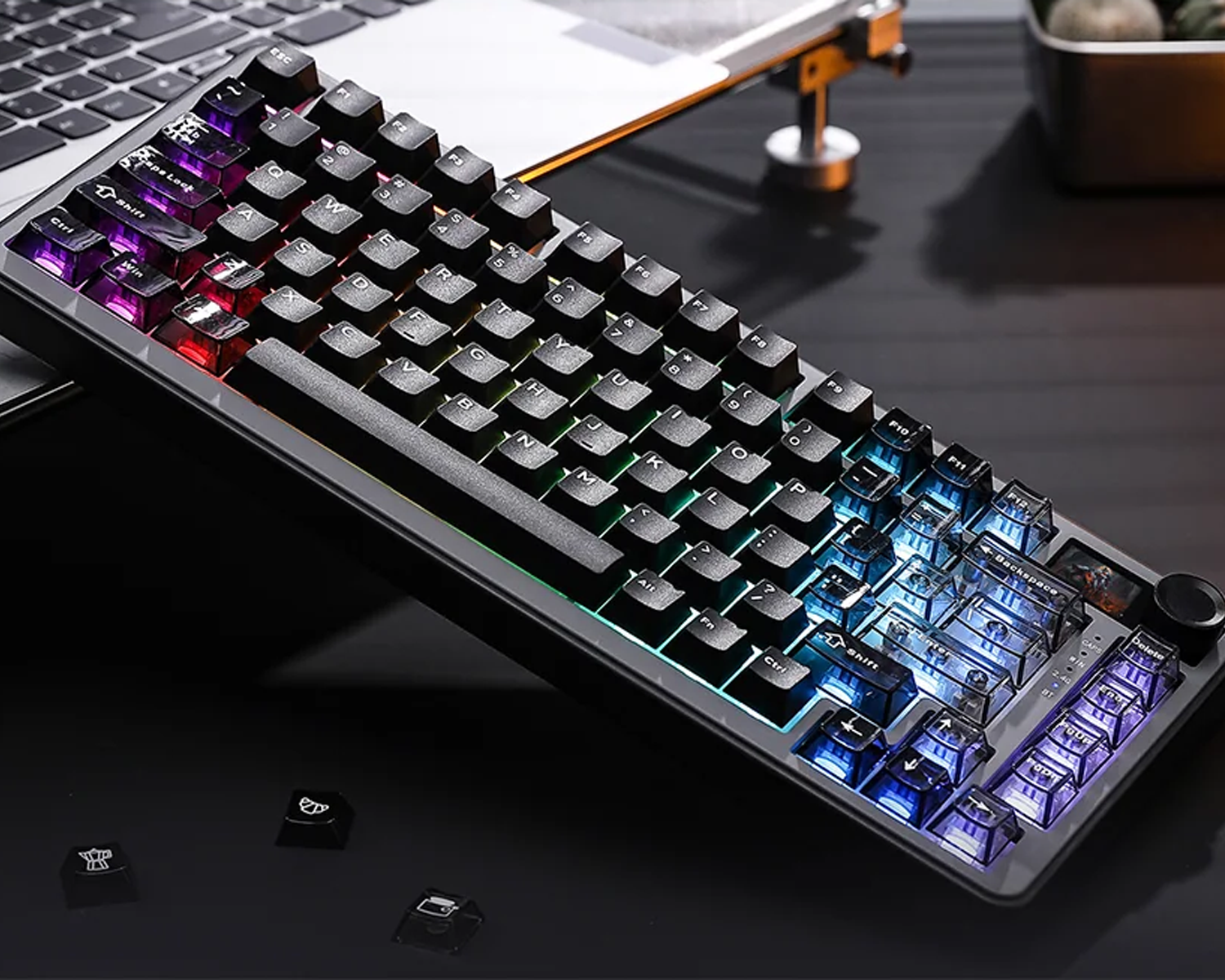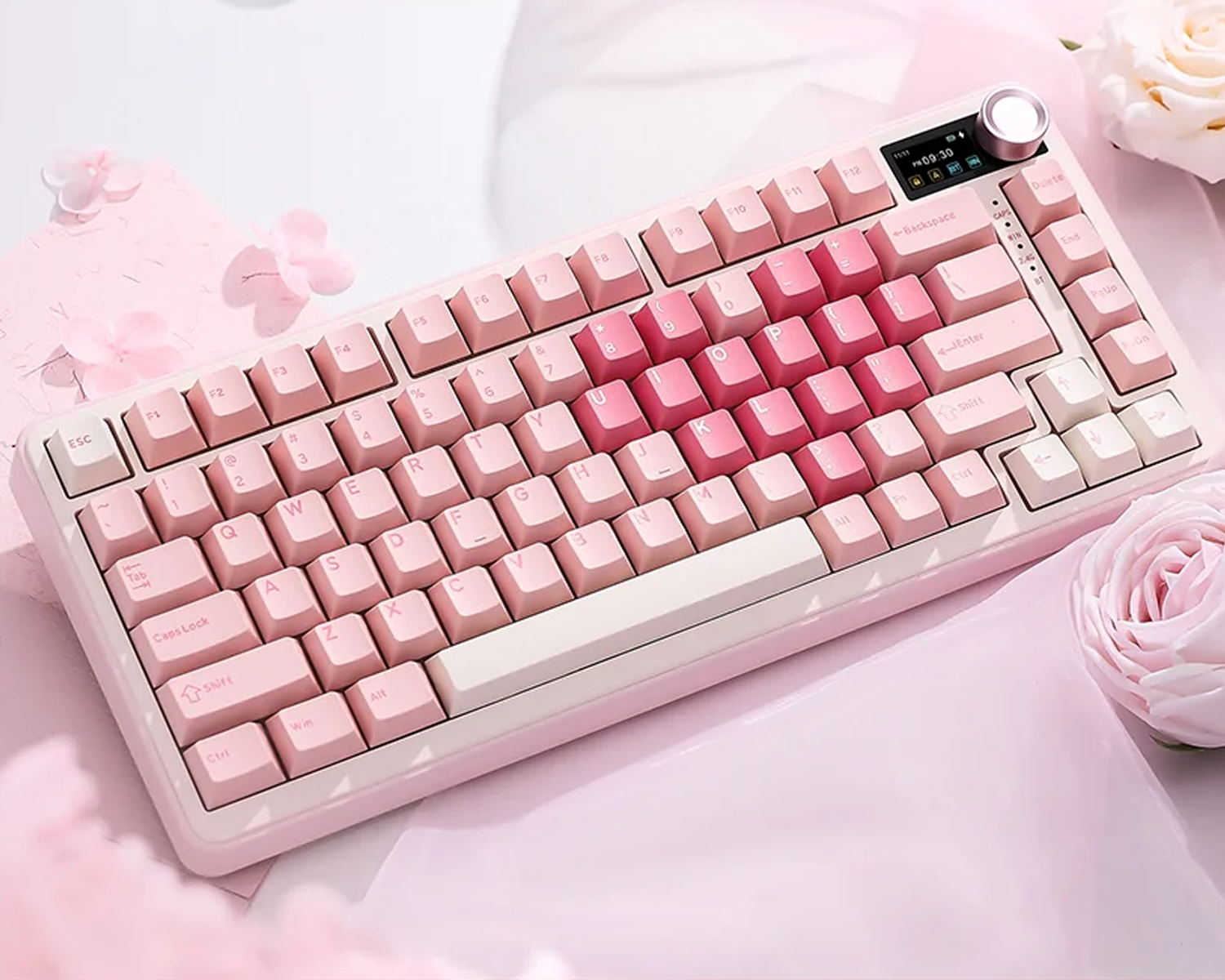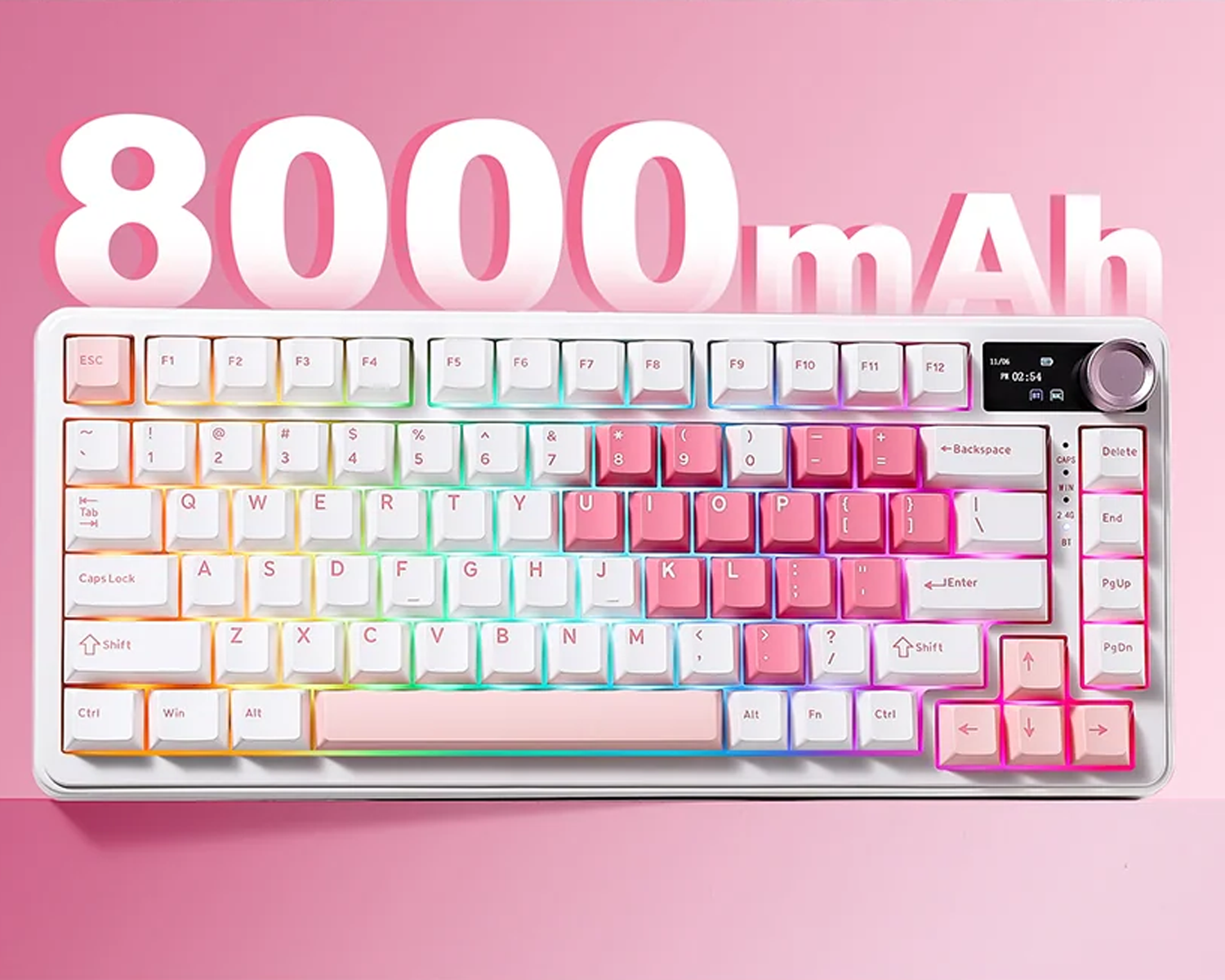 Klavye üzerindeki TFT akıllı ekran; saat, pil durumu ve bağlantı modunu anlık olarak gösterirken, yüklediğin görselleri ve GIF’leri de sergilemeni sağlar. Yan taraftaki multimedya knob sayesinde ses açma-kısma, mute ve menü geçişleri tek dokunuşla yapılır.